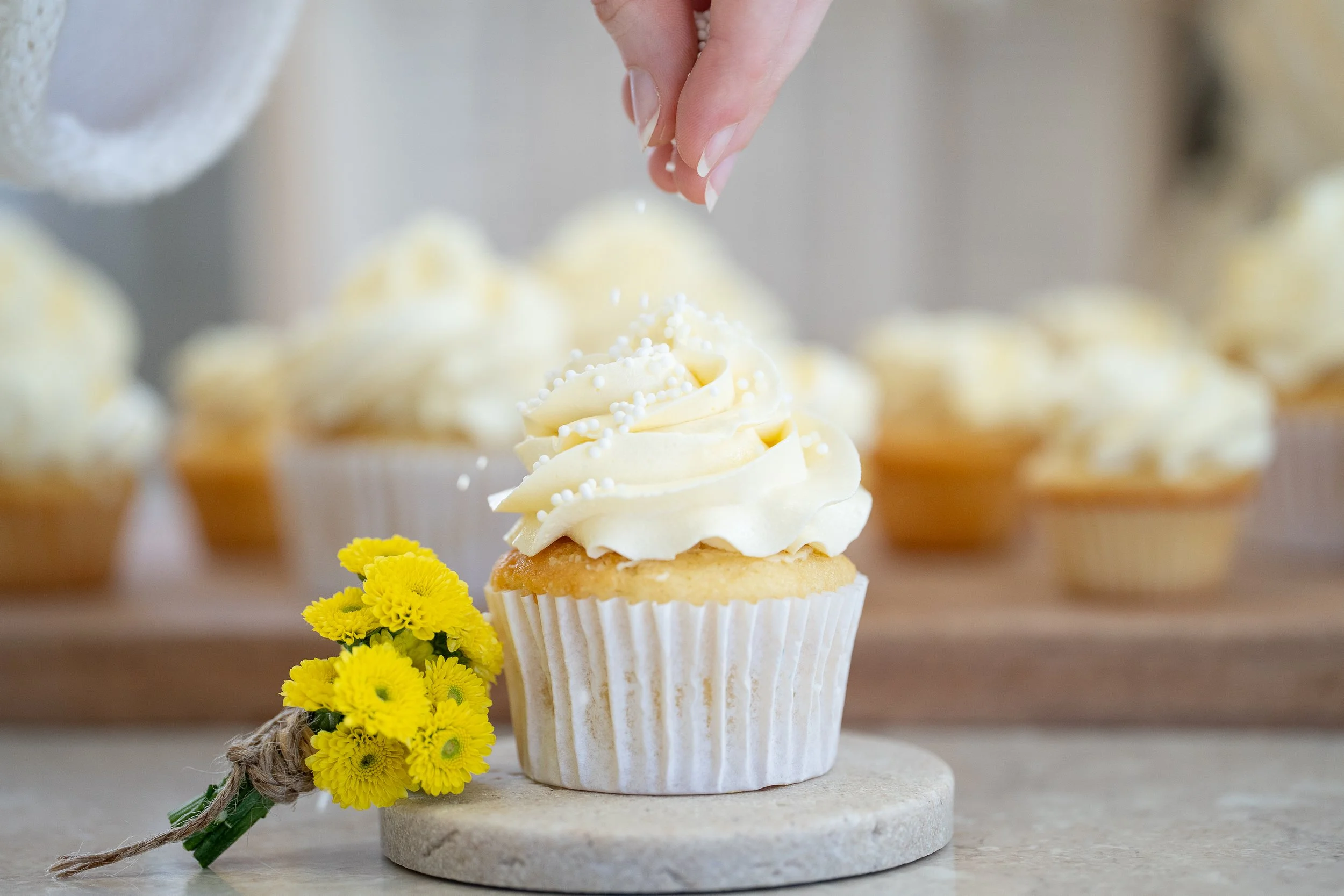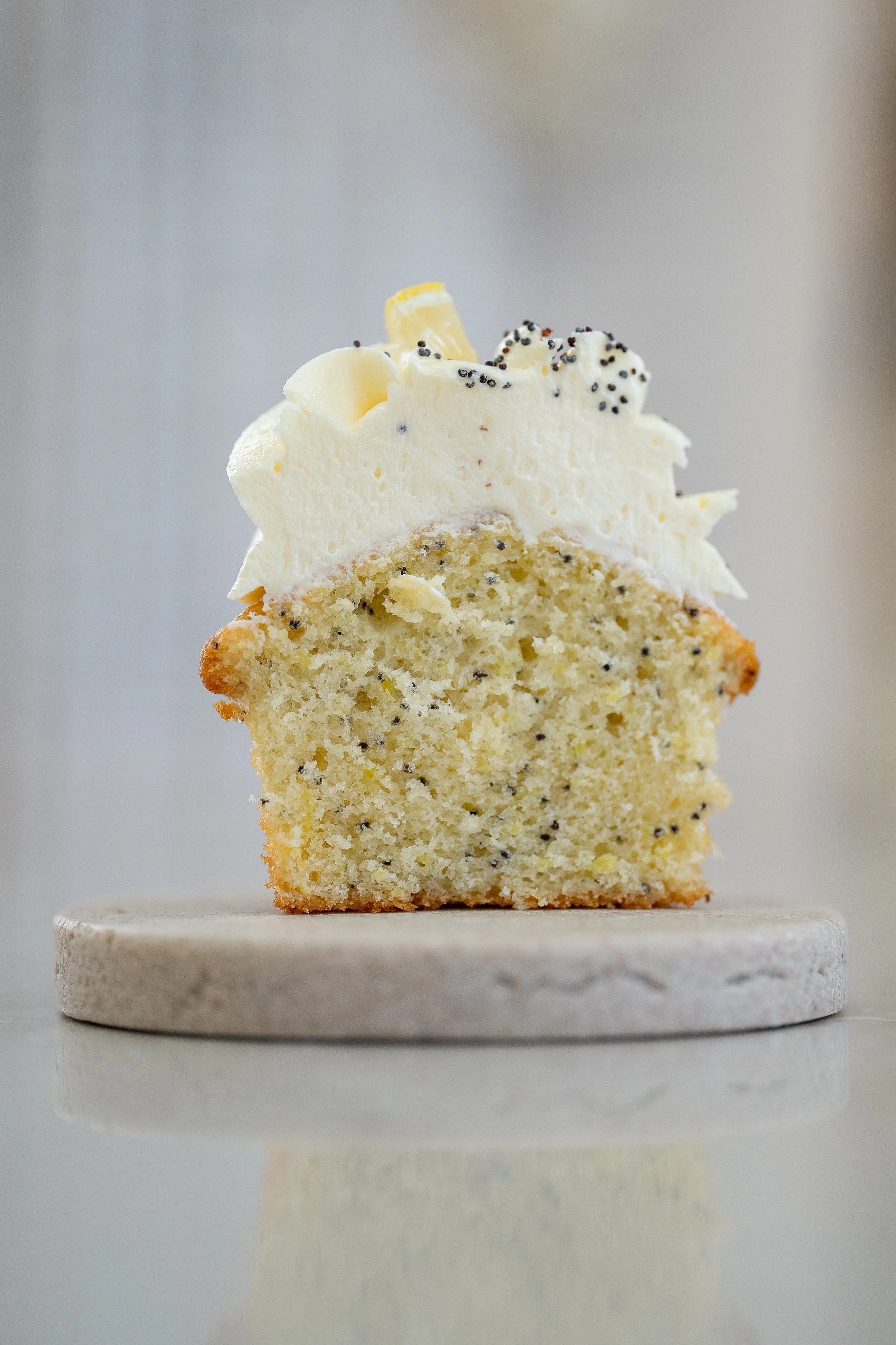 Bright and zesty, our lemon & poppy seed cupcakes are made with a soft, citrus-infused sponge, topped with a swirl of lemon buttercream. Finished with a sprinkle of poppy seeds, they’re the perfect balance of tangy and sweet!